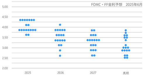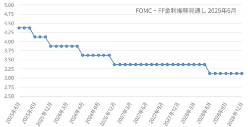 2025年9月FOMCではFF金利を0.25%引き下げて4.00-4.25%へ。FOMCメンバー予想では、2025年末時点でのFF金利予想中央値は3.6255%。2026年末には3.375%。2027年末、2028年末は3.125%。中立金利とみなされる長期見通し中央値は3.000%。