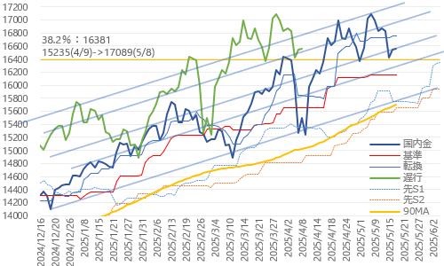 一目均衡表では転換線(16758)を下抜け、基準線(16162)にはまだ距離を残して一役揉み合い状態に。残る二役は好転状態継続、遅行線は次週、月末にかけて相対する26日前価格が急騰し、跳ね上がるか、潜って急落か、相場急変リスクに警戒すべきタイミングにも。中長期上昇トレンドにおいては4階層に分かれる上昇チャネル形成の様相にも。目先、中央ラインを維持できれば第2階層を維持してゆるやかな上昇トレンドにも。これを維持できなければ第3階層へ、4月安値(15235)から5月最高値(17089)の38.2%戻し(16381)近辺がサポート候補に。
