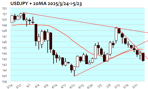 ドル円は-142銭、0.99%の反落で5月6日(142.40)以来、半月ぶりの安値。東京朝に高値144円を割れると午後には143円半ば、欧州時間には143円前半へと軟調推移。その後トランプ米大統領の「アップルがiPhoneを国内製造しない場合、最低25%の関税を課す」発言、さらには「EUからの輸入品に6月1日から50%の関税を課す」発言を受けてリスク回避の流れが急加速、株価急落とともにドル安の流れで143円割れへと急落。安値では142円40銭台まで下落し、NY終盤にかけて142円半ばで下げ渋り。143円半ばの節目割れに伴う短期下値目安142円半ばに到達して一服感も、トランプ関税とその関連発言に振り回される状態はまだ収束せず。144円を回復できれば145円半ば辺りまでの反発も。
