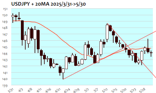 ドル円は-13銭、0.09%の小幅続落。トランプ関税政策を巡る不透明感から上値の重い展開は続き、143円台後半を中心とした保ち合いに終始。東京朝には国内インフレ指標上振れを受けて144円10銭近辺からの軟調推移で143円40銭台まで下落。これが安値となって下げ渋るも反発局面では144円が上限となり、欧州時間にかけて保ち合い推移、NY朝にはトランプの中国批判発言を受けて143円40銭台まで小幅に急落も東京朝の安値を下回らずに切り返し、PCE結果への反応は限定的となり、NY午後には一時144円40銭台まで上昇する場面も、NY終盤にかけては144円近辺に収束。引き続き142円半ばから145円付近までの主要レンジを維持して雇用統計の週へ。145円超へと反発なら146円台再トライ、142円半ばのサポート割れの場合には141円近辺までを目安に下値トライ再開へ。