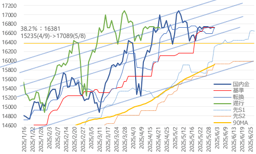 一目均衡表では基準線(16726)を下抜けて三役好転崩れ。転換線(16715)をわずかに上回るも、遅行線は26日前価格(16990)を下抜け。一役好転、一役逆転、一役は揉み合いの中立状態となって方向感も喪失気味に。遅行線は今後、乱高下状態の26日前価格ラインと相対することになり、これに伴う急変動リスクも高まることにも。4月安値(15235)から5月最高値(17089)の23.6%戻し(16651)が目先のサポートに、保ち合い崩れで急落の際には38.2%戻し(16381)、雲の上限、広めの高値保ち合い下限などが集中する水準が比較的強めのサポートとなる可能性も。