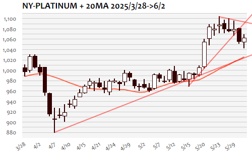 NYプラチナ:1,063.2 ドル 6/2(月) ▲8.3(0.79%)
