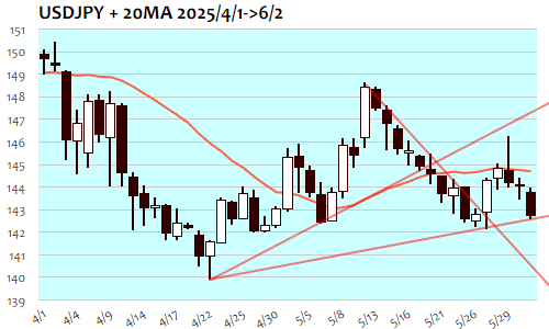 ドル円は-135銭、0.94%安で3日続落。週末の144円ラインが上限となる形で東京朝には143円30銭台まで軟調推移。午後の自律反発も限定的となって欧州時間には143円割れ、関税を巡る米中対立懸念がドル売り圧力に。NY朝にかけては142円後半から143円回復トライを試す場面もあったものの、予想外のISM製造業景況指数悪化を受けて142円50銭台へと急反落。これが安値となって下げ渋ると米中首脳会談の可能性なども報じられ、NY午後には143円付近まで反発。結果的に142円半ばの節目近辺では下げ渋る展開となったものの、米指標悪化や米中関係悪化懸念再燃などからこれを維持できなくなれば141円近辺までを目安に一段安トライへ。