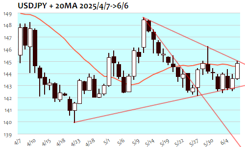 ドル円は+125銭、0.87%の続伸で5月28日(144.88)以来、1週間ぶりの高値。東京朝の143円半ばが安値となって堅調推移。米中協議進展期待なども背景にゆるやかな上昇基調で東京市場終盤には144円回復トライ、144円近辺での小康状態となった欧州時間を経てNY朝には米雇用統計の予想外の上振れを受けて144円後半へと急騰。高値では一時145円台まで上昇し、NY終盤にかけても144円90銭近辺で高止まり。事前の米労働指標悪化が続いていたこともあり、巻き戻しの流れが急速に進み始めた可能性も。144円の節目を上抜けたことでドル安局面一服となる可能性、一定の反発局面形成へと向かいやすい状況となり、短期上値目標は146円半ば辺りまで。