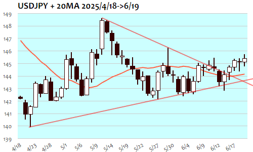ドル円は+29銭、0.20%の反発で5月16日(145.64)以来、5週間ぶりの高値。前日FOMC後の反発一服となった流れで東京朝には144円70銭台までの下押しを経て堅調推移へ。中東情勢緊迫化によるドル買い優勢の流れで東京市場終了時にはFOMC後の高値を上抜けて145円40銭台へ、欧州時間には145円70銭台まで一段高。これが高値となってNY午前の時間帯までは145円半ばをはさんでの保ち合い、午後には145円40銭台で小康状態に。イラン攻撃への米国介入への警戒感と外交の余地への思惑も交錯し、ドル買いの流れも限定的となった様子も。145円の節目上抜けに伴う短期上値目標148円近辺までを目指す流れは継続へ。