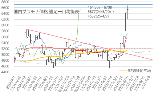 足下では、2024年5月20日の高値(5877)から、今年4月7日につけた安値(4532)までの下落幅(1345)の161.8%戻し(6708)付近まで急騰。