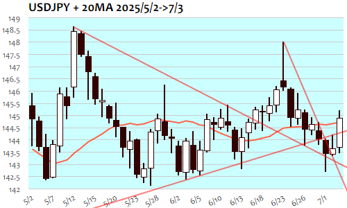 ドル円は+126銭、0.88%の続伸で6月25日(145.27)以来、1週間ぶりの高値。東京朝の143円40銭台が安値となり、午後には143円90銭台まで上昇、欧州時間は143円80銭台を中心に小幅保ち合い推移。NY市場ではサプライズとなった雇用統計の結果を受けて143円80銭近辺から145円20銭台まで、140銭程の急騰で反応。144円60銭台までの揺り戻し後には、ISM非製造業景況指数の好結果を受けて145円10銭台へと反発。NY午後には145円ちょうど近辺で小幅保ち合い、NY終盤にはやや失速。145円30銭の節目手前でいったん上値を押さえられた格好にもなり、143円40銭までが目先の主要レンジに。上限突破できればもう一段の反発局面形成へ、146円後半までが短期上値目標に。