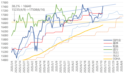 14日の国内金価格は先週末から+325円、1.90%の大幅続伸。最高値となった6月16日(17508)以来、4週間ぶりの高値。上げ幅では今年の絶対値平均128円の2.54倍、今年5番めの急騰となり、17080円の節目上抜けに伴う短期上値目標17200円近辺を突き抜けてさらに一段高。最高値(17508)から5月末安値(16618)の76.4%戻し(17298)も達成し、全戻しも目前に。短期的にはオーバーラン状態も、流れとしては調整局面を終えて反発に転じた流れがようやく加速し始めた?ところ。今週の米インフレ指標や利下げ見通し動向、関税動向などに振られる展開のなかで最高値更新も視野に。