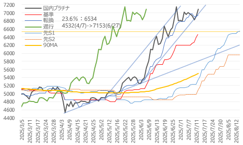 プラチナ価格は+161円、2.32%の続伸。今年高値の6月27日(7153)以来、半月ぶりの高値。9日移動平均線(6947)を再度上抜けて強気のパーフェクトオーダー再開となった流れのまま、一段高トライの様相に。7010円の節目を突破したことで高値更新トライへの可能性、やや勢いには欠けるものの、短期上値目標としては7200円台トライへ。