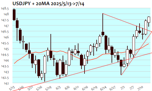ドル円は+35銭、0.24%の続伸で5月12日(148.47)以来、2ヵ月ぶりの高値。週末にEUへの関税30%を発表したことからユーロ安ドル高の流れが強まり、この影響で週明けのドル円もドル高円安スタートとなって147円50銭台まで上昇。しかし巻き戻しの流れへと不安定な流れに巻き込まれる形で146円80銭台へと急反落。これが安値となって切り返すと午後には147円40銭台まで反発。欧州時間からNY午前まで147円前半での小幅保ち合い推移となり、米10年債利回り上昇に連れてNY午後には147円70銭台まで上昇。目先、CPI結果次第で148円トライへの可能性も残しながら、短期的には一服感も。146円20銭の下値サポートを割り込んだ場合には145円前後までの調整も。