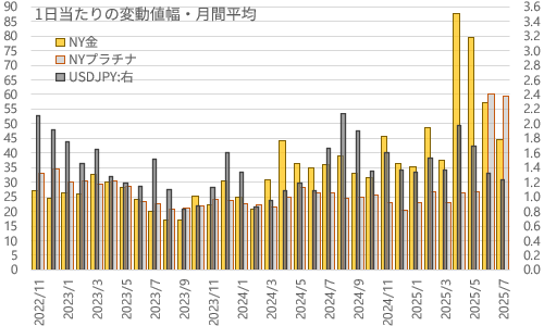 なお、NY金の変動値幅は2020年3月が64.1ドル。今年、2025年4月に87.8ドルとこれを上回り、5月も79.6ドル。その後落ち着き始めて6月に57.1ドル、7月は44.5ドルへ。