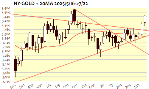 22日のNY金は+37.3ドル、1.09%高で3日続伸。終値ベースで過去最高値となった6月13日(3452.8)以来、5週間ぶりの高値。前日の急騰一服となった時間外は3410ドル台から3400ドル近辺へと軟調推移。3400ドルの大台割れでは下げ渋り、NY市場では米10年債利回り低下とドル安基調に連れて押し目買い、3440ドル近辺へと急騰。高値となった3440ドル台後半では上値を押さえられる状態が続いたものの、NY引け後も3440ドル近辺を維持。3370ドルの節目突破に伴う短期上値目標3480ドル近辺まで、もう一段の上昇余地も。