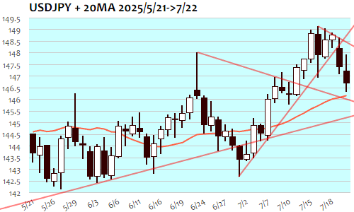 ドル円は-71銭、0.48%の続落で7月10日(146.24)以来の安値。東京朝の147円20銭台から反発の流れとなって東京市場終了時には147円90銭台まで上昇。これが高値となって148円手前で失速すると欧州時間には147円30銭台へと反落。NY市場では米10年債利回り低下に連れて軟調推移、147円を割れると一段安となってNY午後には146円30銭付近で下げ渋り。NY終盤には146円半ばから60銭台へと反発。147円80銭の節目割れに伴う短期下値目安146円半ばに到達したことから短期的には調整局面一服となる可能性も。5月安値(142.11)から7月高値(149.18)の38.2%戻し(146.48)も達成し、多少の行き過ぎ目安としては半値戻し(145.65)近辺、145円半ば辺りまで。