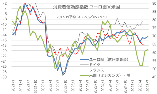 米欧ともにトランプ関税ショックで急激に落ち込んだ春からは急回復し、関税合意がまとまりつつある現状から今後、米欧の消費センチメントも一段と回復していく可能性も期待されそうです。