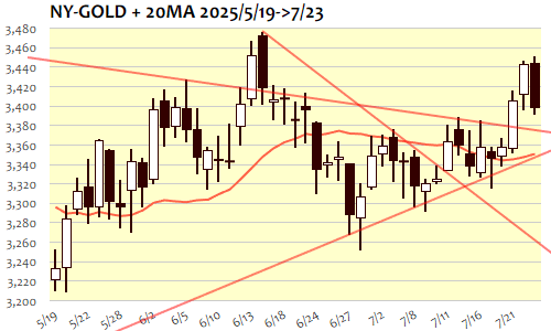 23日のNY金は-46.1ドル、1.34%の大幅安で4日ぶりの反落。アジア時間に前日高値を上回って3450ドル台へと一段高トライ。6月16日(3476.3)以来、5週間ぶり高値をつけて失速後もロンドン市場にかけては3430ドル台までで下げ渋り。しかし、NY市場ではリスク選好の株高基調に連れて売り圧力が急速に強まり、3400ドル割れへと急落。日米関税合意に続いてEUとも合意に近づくなどの報道もあり、トランプ関税リスクの巻き戻しが急速に進行し始めた格好にも。結果、3370ドルの節目突破に伴う短期上値目標3480ドル近辺トライは3450ドル台到達で力尽きてしまった形に。3330ドルから3450ドルまでが目先の主要レンジとなり、3330ドルを維持できなくなるようだと調整局面拡大へ、3200ドル近辺までが下値目安に。
