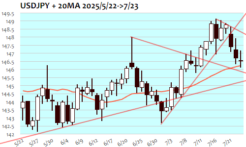 ドル円は-17銭、0.12%の小幅安で3日続落。7月10日(146.24)以来、2週間ぶり安値圏での推移。東京朝にはトランプ大統領の日米関税合意発表を受けて乱高下。146円半ばからの急落で146円付近から147円付近までのレンジで上下動、石破首相退陣報道に対しては円安の流れとなって147円20銭近辺まで上昇。147円を挟んでの保ち合いとなって東京午後の時間帯を通過すると欧州時間には146円前半へと軟調推移。NY市場にかけては売り買い交錯となって146円半ばで保ち合いレンジを縮小。対EU他、関税合意に向けた期待感などからのリスク選好の流れと、国内では首相退陣否定発言報道を受けた円高圧力もあり、やや方向感に欠ける展開に。147円80銭の節目割れに伴う短期下値目安146円半ばにしっかり到達し、短期的には一服感となった格好にも。引き続き、5月安値(142.11)から7月高値(149.18)の半値戻し(145.65)近辺、145円半ば辺りまでがもう一段の下値警戒水準。