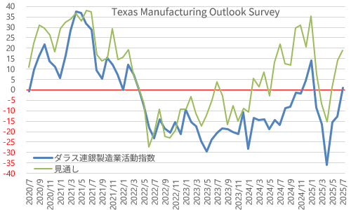 7月のダラス連銀製造業活動指数は0.9。6月から+13.6の急上昇。コロナ後最低で4年11ヵ月ぶり低水準となった4月(-35.8)からは3ヵ月続伸、半年ぶりのプラス圏へと急回復。