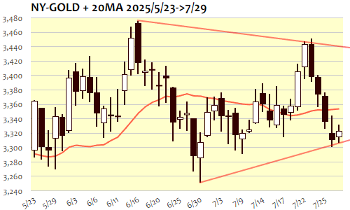 29日のNY金は+14.0ドル、0.42%高で5日ぶりの反発。アジア時間の3300ドル台半ばが安値となって下げ渋り。3330ドルの節目割れに伴う短期下値目安3200ドル近辺までを目指す可能性もあった下値トライは失敗。前日安値3300ドルの大台ラインまでで折り返す形となり、FOMC前の警戒感を抱えながらもゆるやかな反発基調となってNY市場では高値で3330ドル台まで上昇。3310ドルが目先の下値サポートとなり、FOMCでの利下げ示唆などハト派色が強まれば反発局面継続へ、あらためて3310ドル割れの場合には6月末安値圏3280ドル台辺りまでが短期下値目安に。
