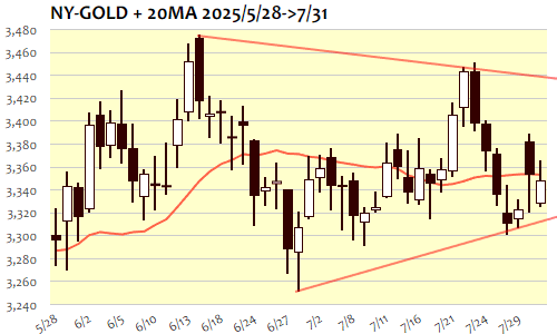 NY金:3,348.6 ドル 7/31(木) ▼4.2(0.13%)