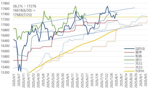 一目均衡表では基準線(7197)を下抜けた転換線(7097)を下回る状態が継続。遅行線も26日前価格(6881)を今朝時点で下抜けて二役逆転。ただし遅行線は26日前価格ラインとの揉み合い局面にも。4月安値から7月高値の23.6%戻し(6874)近辺から大きく外れなければ、揉み合い状態継続で下げ渋る展開にも。8月中旬から後半にかけては上昇軌道の雲の上限にぶつかる展開も予想され、上昇トレンド継続に向けてはここで跳ね上がる展開は必須。8月は昨年まで8勝8敗の五分。トレンド分岐点にも差しかかる、勝負の月に。