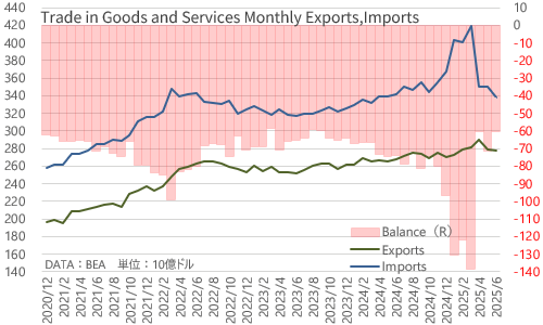 貿易赤字の縮小はともかく、米国の輸出入はトランプ関税の影響により、従来のゆるやかな拡大基調が崩れた混乱期が続きます。