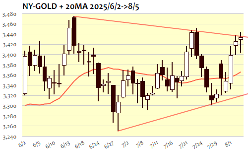 5日のNY金は+8.3ドル、0.24%高で3日続伸。7月22日(3443.7)以来、2週間ぶり高値圏での堅調推移。時間外には3430ドル近辺から軟調気味に推移、ロンドン・NY朝にかけては3410ドル割れへと一段安。3400ドル手前が安値となって下げ渋ると金利低下とドル安基調に連れて反発、米7月ISM非製造業景況指数が予想を下回ったことで流れは加速、高値では3440ドル台まで上昇。NY午後には3430ドル台へと戻して小康状態に。下ヒゲ陽線となって高値圏再トライに向けた流れを維持も、3450ドルの節目手前ではやや失速感も。強めの抵抗水準となりうる節目水準を突破できれば最高値更新トライへ、短期上値目標は3500ドル台後半も。