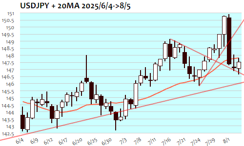 ドル円は+50銭、0.34%高で3日ぶりの反発。前日までの軟調局面の余波で東京朝には146円60銭台まで下落、7月24日(145.85)以来2週間ぶり安値をつけて切り返すと午後には147円20銭台まで反発。欧州時間には米10年債利回り上昇にも連れて147円70銭台まで上昇。147円60銭台を中心に小幅揉み合い推移となったNY朝にかけて147円80銭台の高値をつけた後、ISM非製造業景況指数の下振れを受けて147円30銭台まで急反落、しかし下値も堅くNY午後には147円半ばを回復。目先、下値サポートを147円ラインに切り上げ、これを割り込んだ場合には145円半ばを目安に下値トライへ。上方向には引き続き20日移動平均線(147.82)が攻防ラインに。