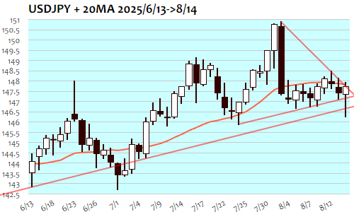 ドル円は+37銭、0.25%高で3日ぶりの反発。前日NY市場でのベッセント米財務長官によるFRBへの9月0.5%利下げ強要と、日限の利上げを支持する口先介入の余波で東京朝にはドル安円高基調が急伸、147円30銭台から146円30銭台まで急落、午後の反発も限定的となって東京市場終了時には146円20銭台の安値をつけて下げ渋り。146円50銭近辺での小幅揉み合い推移となった欧州時間を経てNY朝には予想外のPPI上振れを受けて147円台へと急騰、NY午後には147円後半へと水準を切り上げ、高値では147円90銭台まで上昇。長めの下ヒゲを残しての反発も前日高値は超えられず、20日移動平均線(147.83)もレジスタンスに。目先、147円30銭へと下限を切り上げて148円20銭までのレンジで保ち合い継続へ。あらためて下限を割り込むようなら下値再トライ、144円半ば辺りまでを目指す流れにも、上抜けできれば上値トライへ、150円台半ば辺りまでが上値目標に。