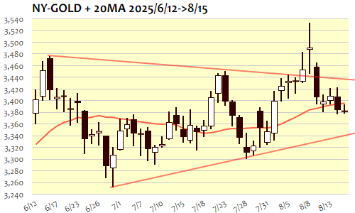 15日のNY金はわずかに-0.6ドル、0.02%の小幅続落。7月31日(3348.6)以来、半月ぶりの安値。アジア時間序盤の3370ドル台後半が安値となり、反発局面でつけた高値は3390ドル台半ばまで。ロンドン・NY市場にかけてやや軟調気味の推移もほぼ3380ドル台での保ち合い推移。この日の変動値幅は17.1ドルにとどまり、今年の平均55.7ドルの3割で今年最小タイ。先週末から週明けにかけての急変動一服後の小康状態に。引き続き3390ドル割れに伴う短期下値目安3360ドル近辺を目指す軟調局面継続、反発方向には3410ドルの節目上抜けなら反転、3450ドル近辺までの上値トライへ。