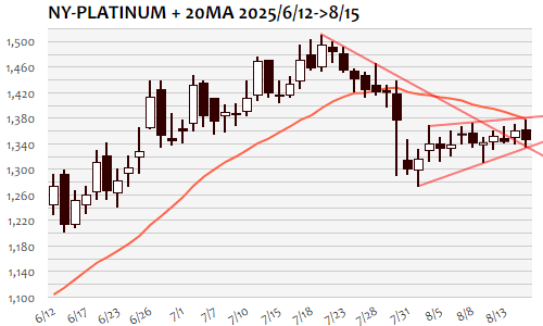NYプラチナは-16.3ドル、1.20%の反落。アジア時間には1360ドル台から1370ドル台へと上値トライ、前日高値を超えて7月30日(1439.8)以来半月ぶり高値も、1380ドルには届かず失速、1360ドルの節目上抜けに伴う短期上値目標1420ドル近辺を目指す上値トライは早々に失敗。折り返す形で急反落となったロンドン・NY市場にかけて1350ドル近辺へ、NY市場でつけた安値は1330ドル付近、NY午後には1340ドル台後半へと反発。1330ドルから1370ドルまでのレンジで保ち合い仕切り直し。下方ブレイクなら1260ドル近辺までが短期下値目安に、上方ブレイクなら1400ドルの大台回復再トライへ。