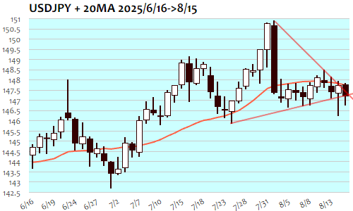 ドル円は-57銭、0.39%の反落で8月7日(147.13)以来、1週間ぶりの安値。東京朝の147円80銭台が高値となって軟調推移、国内4-6月期実質GDP好結果に伴う早期利上げ観測から円買いドル売りの流れとなり、午後には147円30銭の節目割れ。欧州時間には146円70銭台までの一段安で下げ渋り、NY朝には7月小売売上高が予想どおり、8月NUY連銀製造業景況指数は予想外の好結果、輸入物価指数も予想を上回り、一時147円20銭台まで急反発。しかし7月鉱工業生産や8月ミシガン大消費者信頼感指数は予想を下回り、147円割れへと失速。ただし期待インフレは予想を上回り、NY午後には147円30銭台まで反発。ただ、NY終盤には147円30銭の節目を維持し切れず、週明けには下値トライへと向かいやすい状況に。短期下値目安は144円半ば辺りまで。ただし147円80銭超へと切り返すことができれば150円台半ばを目指す反発トライへも。