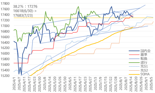 18日の国内金価格は先週末から-13円、0.08%の小幅続落。7月31日(17230)以来、半月ぶり安値圏での軟調局面継続。週末時点で17440円の節目割れに伴う短期下値目安17320円近辺に到達したところで下げ止まり切れず、RSIも50.4%の中立水準。多少の行き過ぎで意識されるのは7月末安値17230円、短期ダブルボトムの可能性を残して下げ止まれるかどうか。反発方向へは9日移動平均線(17416)と21日移動平均線(17414)との攻防水準突破で地合い回復へも。