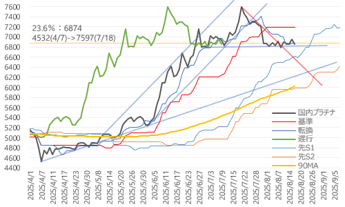 プラチナ価格は-93円、1.34%の反落で8月8日(6792)以来、10日ぶりの安値。6900円の節目上抜けに伴う短期上値目標7140円近辺トライは失敗、週末の上げ幅全戻しとなって9日移動平均線(6872)も再び下抜け。このまま6850円の節目も割り込むようだと今度は保ち合い下放れ、6580円辺りまでが短期下値目安に。