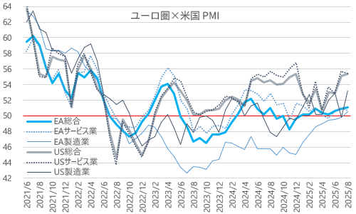 米欧ともに製造業、サービス業、総合PMI全てが節目50を上回るのは2022年6月以来、3年2ヵ月ぶり。