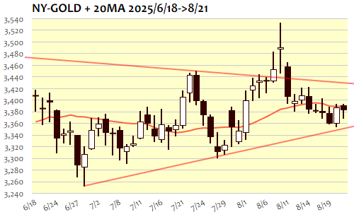 21日のNY金は-6.9ドル、0.20%の反落。アジア時間序盤に前日高値と同水準、3390ドル台半ばの高値から軟調推移、ロンドン市場では3370ドル割れの安値をつけて切り返すとNY朝には米8月のフィラデルフィア連銀製造業景況指数や失業保険申請件数が予想よりも低調となったことを受けて3380ドル台へと反発。ただしドル安も一時的にとどまったこともあり、3390ドル超えでは上値も重く、NY引け後には3380ドル台前半へ。軟調局面から一定の自律反発をこなして一服、結果的に20日移動平均線(3389.7)はレジスタンスのまま、3350ドルから3390ドルまでが目先の主要レンジ。上抜けできれば3410ドル超へと上値切り上げへ、下限割れの場合には下値トライの流れとなって3260ドル近辺までを目指す展開にも。