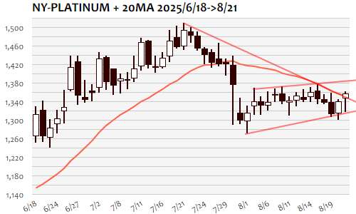 プラチナ価格は+122円、1.78%の大幅続伸で7月30日(7210)以来、3週間ぶりの高値。保ち合いレンジを上下に拡大し続ける逆三角保ち合いが続くなか、今回は上抜け。保ち合い終了の上抜けなら反発局面形成トライへ、短期上値目標は7250円近辺まで。レンジ拡大が続く保ち合い継続なら6740円が当面の、比較的重要なサポートに。割れると大幅安へと向かう可能性も、6420円近辺までが下値目安に。