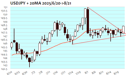 ドル円は+103銭、0.70%高で3日ぶりの反発。7月31日(150.80)以来、3週間ぶりの高値。東京朝には147円20銭台から50銭近辺までの小幅レンジで小康状態、これが安値となって午後には徐々に堅調方向へ、東京市場終了時には147円60銭トライ、欧州時間には147円90銭台まで上昇。NY朝には低調な米指標結果を受けて147円半ばへと下押しも、NY午後にかけて米10年債利回り上昇に連れて148円トライ、高値では148円40銭台まで上昇。トランプ大統領の圧力に屈しないパウエルFRB議長の強気姿勢がジャクソンホールの講演で見られるとの期待感も?そのとおりタカ派的スタンスを維持するようなら一段高トライへ、148円の節目超えに伴う短期上値目標は151円台。ハト派的となれば巻き戻しへ、147円を割り込むようなら下値トライ、143円半ば辺りまでが下値目標に。