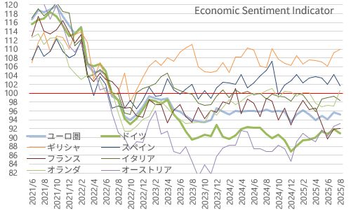 欧州委員会が発表したユーロ圏8月の景況感指数は95.2。市場予想の96.0を下回り、前月比-0.5の反落で2ヵ月ぶり低水準、半年では2番めタイの高水準。
