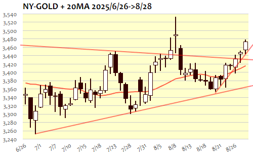 28日のNY金は+25.7ドル、0.57%高で3日続伸。最高値の8月8日(3491.3)以来、20日ぶりで過去2番めの高値。アジア時間に3450ドル近辺から3440ドル台前半へと小幅下押しで下げ渋り、これが安値となって堅調推移再開。米10年債利回り低下に連れたロンドン市場にかけて3450ドル台を回復するとNY市場ではドル安基調にも連れて3470ドル台へと一段高。米GDP改定値の上振れや失業保険申請件数の好結果などを受けて反落の場面もあったものの、逆に押し目となって水準を切り上げる形に。9月利下げに向けた流れが優勢となる状況も、本日のPCE結果次第で状況維持か反転かという展開にも。水準的には3380ドルの下限からの反発局面継続で3480ドルが目先の上限となるかどうか、3500ドル超へと最高値更新の場合には短中期的に一段高の流れで3560ドル台辺りまで上値を伸ばす可能性も。