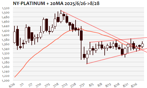 NYプラチナは+13.7ドル、1.02%の反発で8月22日(1363.1)以来、1週間ぶりの高値。アジア時間に1340ドル台から1460ドル近辺まで反発後にはロンドン・NY朝にかけての反落で巻き戻し、1340ドル付近の安値をつけて切り返すとNY午後には1360ドル台へと反発再トライ、高値では一時1370ドルまで上昇。1ヵ月間、上値を押さえられ続けた1360ドル台から1370ドルまでの抵抗帯との攻防状態に。保ち合い下限を1330ドルに切り上げ、8月後半は三角保ち合いの様相となり、確率的には上抜けトライへの可能性がわずかに上回る状況のようにも。上抜け成功なら高値圏再トライで1480ドル近辺を目指す流れへ、下抜けの場合には1200ドル近辺を目指す展開に。