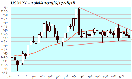 ドル円は-46銭、0.31%の反落で8月22日(146.94)以来、1週間ぶりの安値。東京朝の147円半ばが高値となり、揉み合いながらゆるやかに水準を切り下げる軟調な展開に。欧州時間には147円割れも、NY朝には米4-6月期GDPが予想以上に上方改定され、失業保険申請件数も改善傾向となったことを受けて147円20銭台まで急反発。しかし、これを維持し切れず、米10年債利回り低下にも連れ、NY午後には146円60銭台まで下落。ただしNY終盤には146円90銭の節目を回復。保ち合い下限割れはいったん回避し、7月PCEの結果に委ねる格好に。予想以上のインフレ鈍化なら節目割れ再トライ、保ち合い崩れで142円台半ば辺りまでを目指す流れとなる可能性も。逆の展開で147円80銭超へと抜け出すようなら上値トライへ、151円近辺を目指す展開にも。