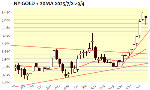 4日のNY金は-28.8ドル、0.79%安となって7日ぶりの反落。4日ぶりの最高値更新ストップで雇用統計前に調整。前日NY引け後の最高値から利益確定売りへ、アジア時間の3620ドル台が高値とって3570ドル台まで急落。急騰前の8月20日安値(3353.4)から最高値(3640.1)の23.6%戻し(3572.4)を達成して切り返すと3580ドル台で下げ渋り、ロンドン・NY市場にかけては3590ドル台から3600ドルの大台回復トライへ。ADP雇用下振れなどを受けたドル安局面では3610ドル台まで上昇も、ISN非製造業景況指数が予想を上回ったことで上値も限定的に。一定の調整をこなして下ヒゲを残して下げ渋り、雇用統計後にドル高の流れが強まるようだと38.2%戻し(3530.6)辺りを目指す流れにも。逆に3640ドル超へと最高値更新なら3680ドル程度までが短期上値目標に。