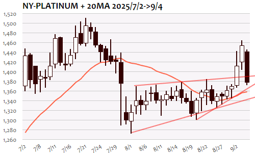 NYプラチナは-78.5ドル、5.39%の大幅安で5日ぶりの反落。8月29日(1370.5)以来、1週間ぶりの安値。下落率は今年の絶対値平均1.59%の3.39倍、今年2番めの急落。アジア時間の1440ドル台半ばが高値となって軟調推移、ロンドン序盤に1430ドルを割れるとNY朝には1400ドルの大台割れへと急落。NY市場では1370ドル台で下げ渋り、急騰前の保ち合い上限付近でサポートされた格好。1370ドルの節目突破に伴う短期上値目標1480ドル近辺に対しては3日高値1465.0ドルまでで力尽きてしまった形に。1370ドル近辺が目先のサポートとならない場合には1330ドルがサポート候補。当面の上限1460ドル超へと切り返すことができれば1500ドルの大台トライへの可能性も。