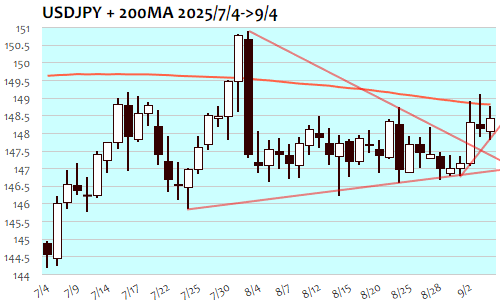 ドル円は+35銭、0.24%の反発で7月31日(150.80)以来、5週間ぶりの高値。東京朝には148円を挟んでの揉み合いとなり、147円80銭近辺の安値をつけて切り返すと午後には148円20銭台での保ち合いに。欧州時間には148円30銭台へと保ち合いレンジを微妙に切り上げ、NY市場では米8月ADP雇用結果を受けて小幅に急落も148円近辺で切り返すと148円40銭台へと反発、ISM非製造業景況指数の上振れを受けて148円後半へ、NY午後には高値で148円70銭台まで上昇。引き続き147円80銭の節目突破に伴う短期上値目標152円台を目指す流れがゆっくりと進行、ただし雇用統計次第で加速か巻き戻しか。当面のレジスタンスにもなりうる200日移動平均線(148.82)を突破できれば加速へ、底堅さを増しつつある148円近辺を割れると146円90銭の節目が目先のサポート、これを割り込むようだと流れは逆転、142円近辺を目指す流れへ。