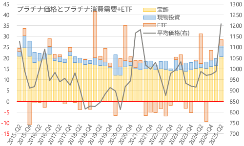 宝飾品需要と現物投資需要を合わせたプラチナ消費需要は25.6トン。前期比+29.0%、前年比+46.9%。9年半ぶり高水準。