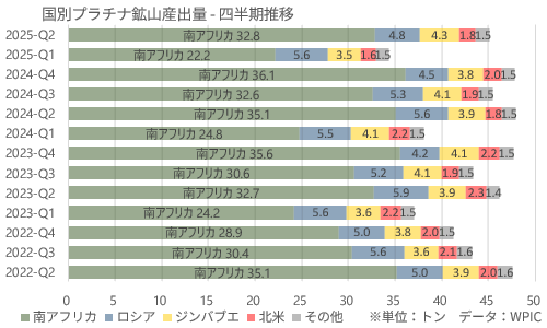 ■鉱山産出量:45.2トン 前期比+34.0%、前年比-7.8%、2四半期ぶり高水準。うち南アフリカ:32.8トン(前期比+47.8%、前年比-6.52%)、2四半期ぶり高水準。ロシア:4.8トン(前期比-13.9%、前年比-14.4%)。2カ国合計シェアは83.2%。