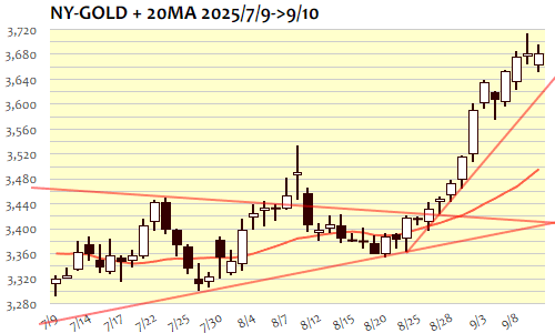 10日のNY金はわずかに-0.2ドル、0.01%の小幅安で4日ぶりの反落。4日ぶりの最高値更新ストップ。前日NY市場でつけた最高値3715.2ドルからの調整の流れは、この日のアジア時間序盤の3650ドル付近までで一服。この日の安値をつけて下げ渋り、反発に転じると「多数のロシア製ドローンによるポーランド領空侵犯」報道も買い材料となってロンドン序盤に3680ドルを回復し、3690ドル台半ばまで上昇。3680ドル台へと反落後のNY朝には米8月PPI下振れを受けて3690ドル台再トライ、しかし3700ドルの大台手前で跳ね返される状態が続いて失速、NY引け後には3680ドル近辺へ。3690ドル台では上値も重く、高値保ち合いの様相でCPI経由FOMCへ。