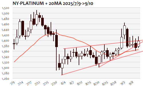 プラチナ価格は+87円、1.22%の反発で9月4日(7369)以来、1週間ぶりの高値。9日移動平均線(7226)割れで強気のパーフェクトオーダー崩れとなって即、切り返し。失速感が強まる前に再び9日線上抜けをかけた攻防へ。8月以降、下値を切り上げる形を維持し、崩れかけた短期上昇トレンドも継続へ。ただし7130円の節目を割れるとトレンド崩れへ、21日移動平均線(7050)も割り込んで7010円近辺までの下値切り下げも。