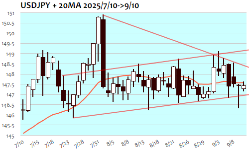 ドル円は+2銭、0.01%の小反発。騰落値幅は2日連続一桁台、この日は変動値幅も51銭にとどまり、今年の平均145銭の3分の1、今年2番めの小動き。147円40銭台を中心に小幅保ち合いに終始。東京・欧州時間は147円20銭台から50銭台までのレンジにとどまり、NY朝には米PPI結果を受けて147円10銭近辺までの安値をつけ、切り返して147円60銭台の高値へ。その後は147円30銭台を中心に小幅保ち合い推移、NY終盤には40銭台へと小幅に上昇。引き続き146円90銭から148円50銭までのレンジで保ち合い継続、CPI経由FOMCなどをトリガに下方ブレイクとなれば142円近辺を目指す流れとなる可能性、逆に上抜けなら153円台を目指す流れにも。