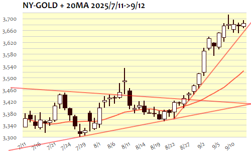 12日のNY金は+12.8ドル、0.35%高で3日ぶりの反発。終値ベースでは3日ぶり、今年33回めの最高値更新。下ヒゲを残した前日の反発局面が続き、アジア時間序盤の3670ドル割れが安値となって堅調推移、3680ドル台へと急騰すると高値では3690ドル台半ばまで上昇。ロンドン序盤の反動安も3680ドル割れでは下げ渋り、ロンドン・NY市場にかけては3680ドル台を中心に保ち合い推移、NY引け後には3680ドル近辺へ。目先の主要レンジとしては引き続き3600ドルを下限に3690ドルから3700ドルが上限候補。足下では3670ドルで下値を固めつつ3700ドルの大台再トライの様相にも。